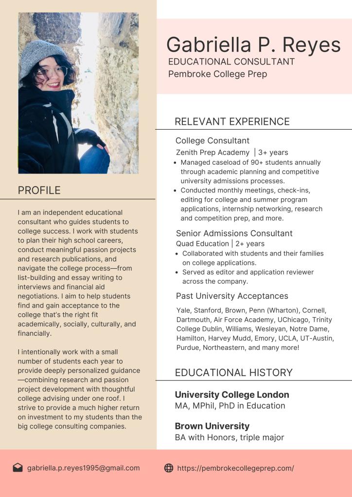 Gabriella P. Reyes holds degrees from Brown University and University College London, as well as teaching licenses for grades 5-12. A veteran college counselor and educational consultant, she has worked at two of the most popular college consulting companies and top prep schools in the Middle East, Asia, and the United States. She draws on best practices from these organizations to guide students toward the best possible educational opportunities. From her Chicago-based office, she is able to support students and families across the United States and around the world.